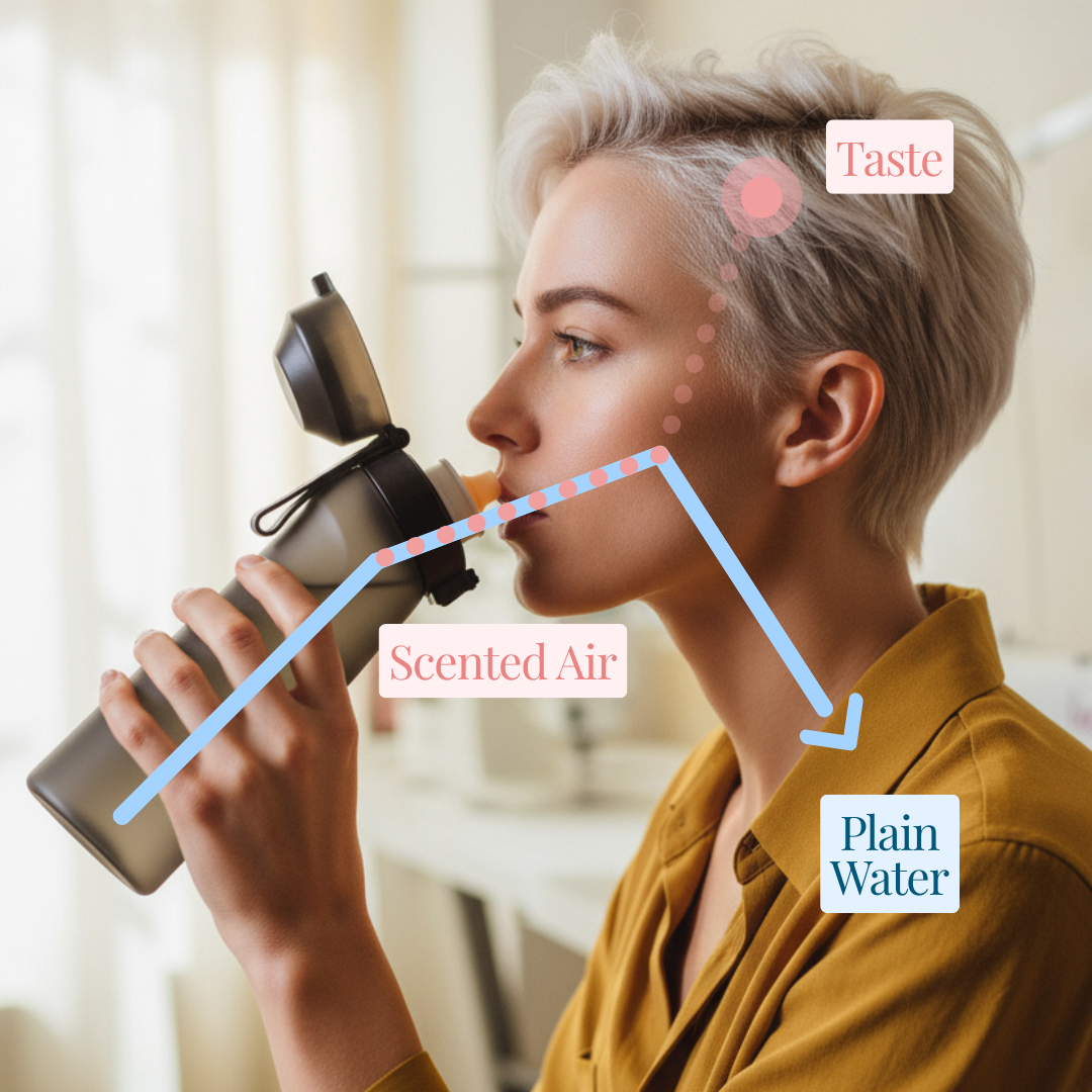 The water flows pure to your stomach, while the aroma activates your retronasal system, making your brain perceive flavour without sugar or calories.